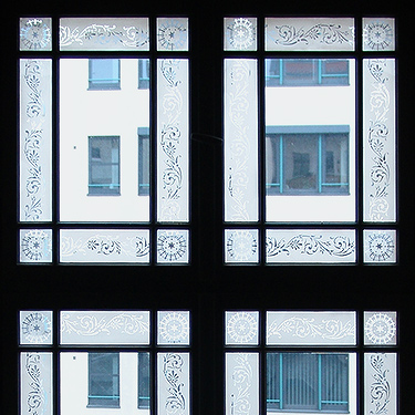 Motivgebung durch Sandstrahlen. Gründerzeithaus, Löhrstraße 8, Leipzig.